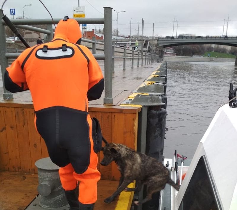 На помощь животному отправился спасательный катер с дежурной сменой ПСС Крымский мост. Пса вытащили при помощи специального оборудования – аркана.
