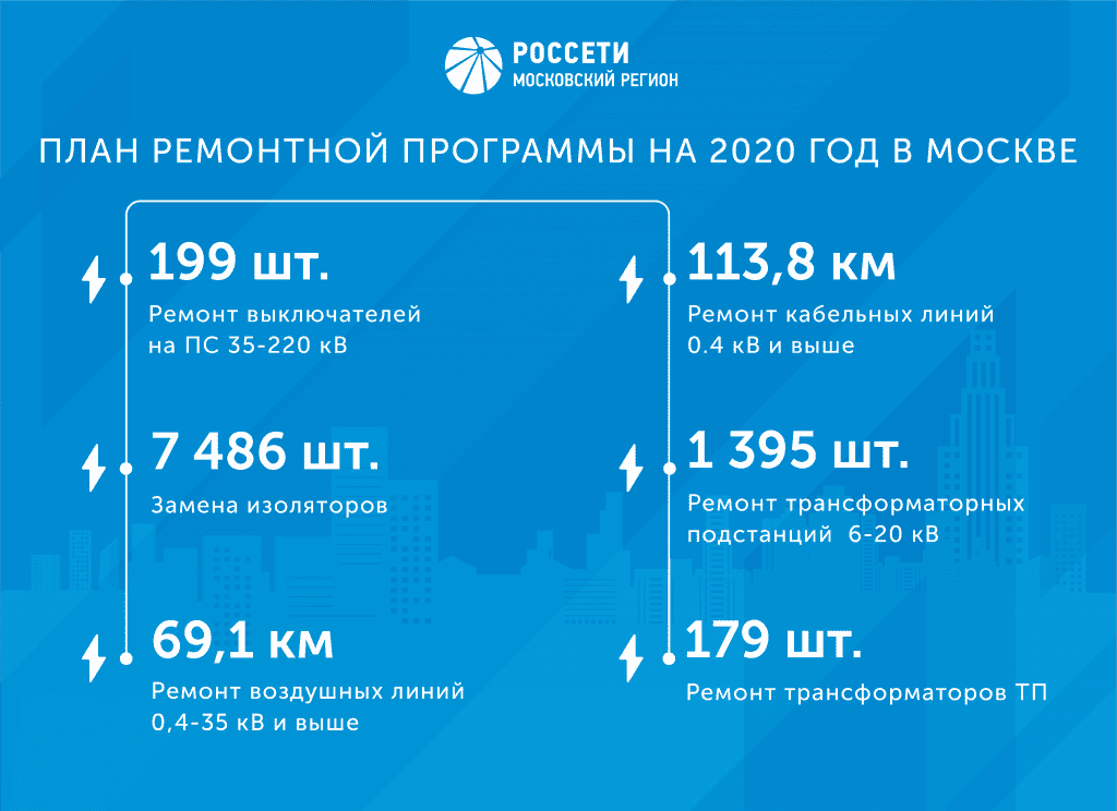 «В текущем году только в Москве планируется отремонтировать более 69 км воздушных линий, более 113 км кабельных линий, 47 силовых трансформаторов и 199 выключателей на ПС 35-220 кВ, 1 395 трансформаторных подстанций и 179 трансформаторов на ТП 6-20 кВ», – сообщили в пресс-службе компании.