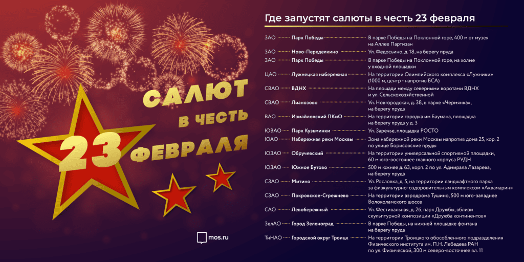 В честь Дня защитника Отечества в Москве пройдет пиротехническое шоу. Праздничные фейерверки запустят с 16 площадок. В течение 10 минут в небо украсят около 10 тысяч салютов.
