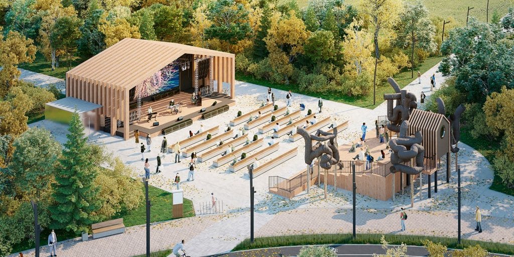 На территории от улицы Мусоргского до проезда Дежнева на месте старой площадки для мероприятий соорудят большую сцену с навесом и местами для зрителей. Теперь здесь появится возможность демонстрировать кинофильмы на большом экране.