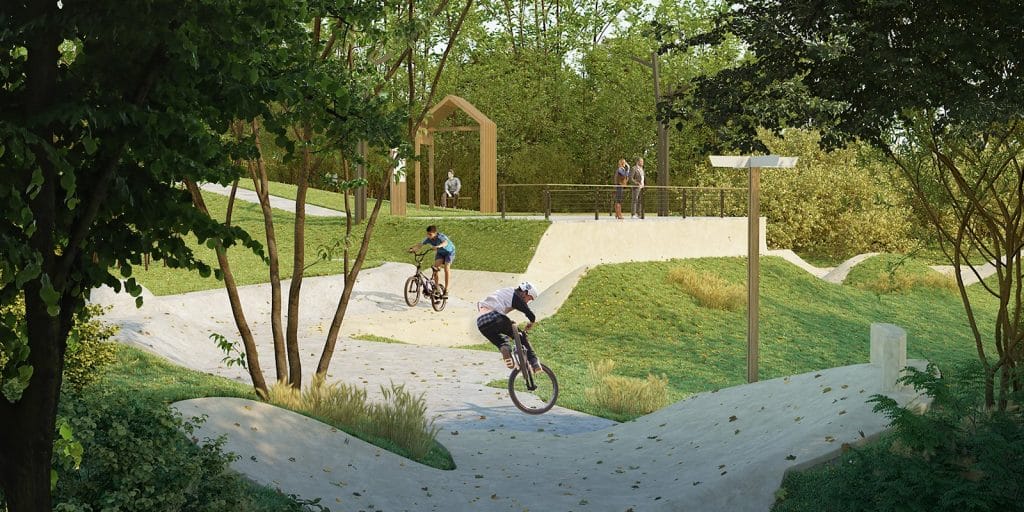 На спортивных площадках в этой части парка смогут заниматься горожане старшего поколения. Также здесь появится памп-трек, а еще места для отдыха и детские игровые площадки.