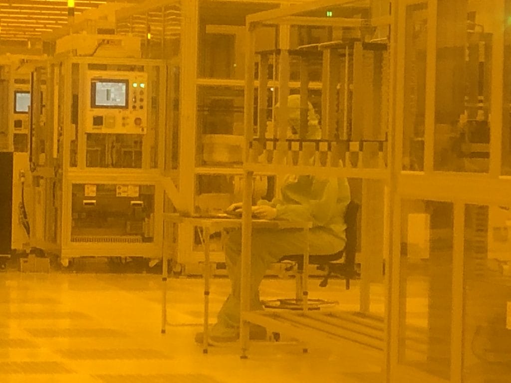 Для производства гибких сенсорных экранов требуются особенные условия. В помещении пятый уровень чистоты. То есть не более 29 частиц на квадратный метр. Стерильность выше, чем в операционной. Здесь также используется специальное желтое освещение, потому что большинство электронных элементов и химических реакций слишком чувствительны и попросту будут испорчены, если применять обычный свет.