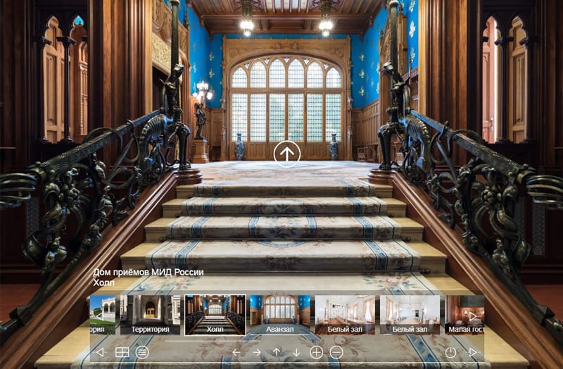 Благодаря сервису возможно «прогуляться» по одному из красивейших зданий Москвы, построенному прославленным архитектором Ф.О.Шехтелем, – особняку Саввы Морозова на улице Спиридоновка, в котором сейчас размещается Дом приемов МИД России.