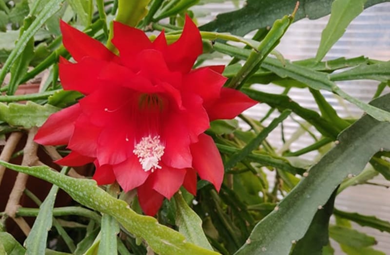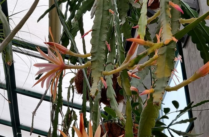 Эффектные кактусы-орхидеи, или эпикактусы, или эпифиллумы, с крупными коралловыми и алыми цветками пышно распустились, благодаря профессиональному уходу сотрудников сада.