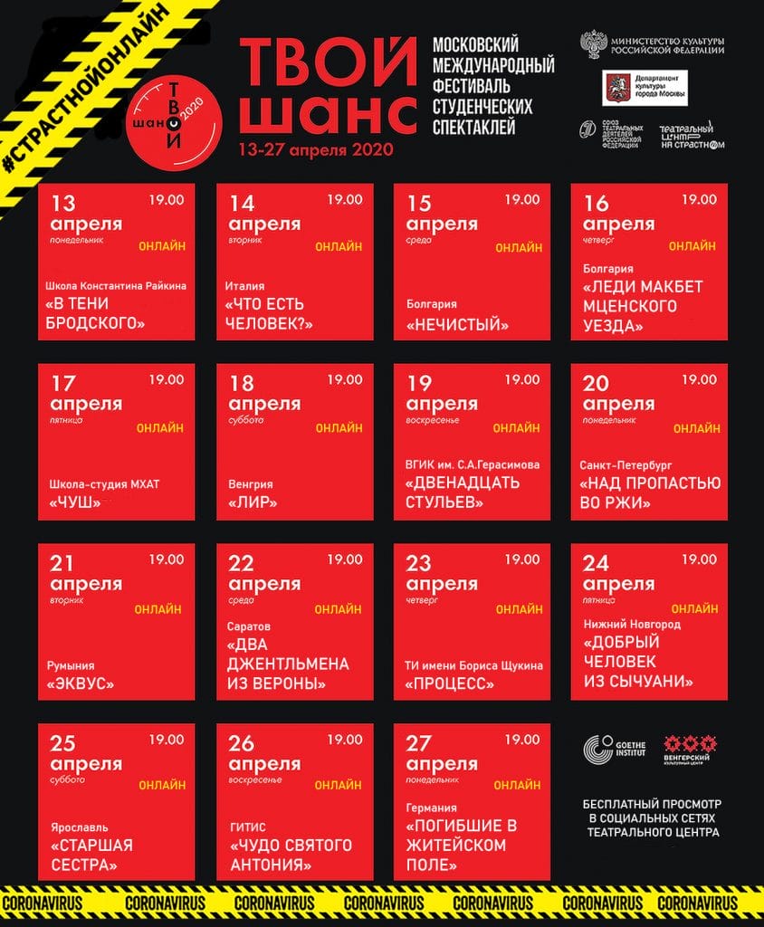 Впервые за 16 лет своего существования спектакли фестиваля «Твой шанс» смогут увидеть зрители из любой точки земного шара. Онлайн-трансляции лучших студенческих спектаклей в течение 15 дней будут транслироваться для всех желающих в социальных сетях Театрального центра согласно афише.