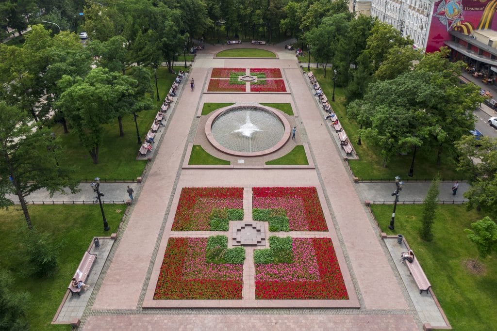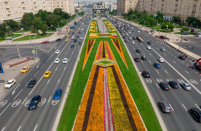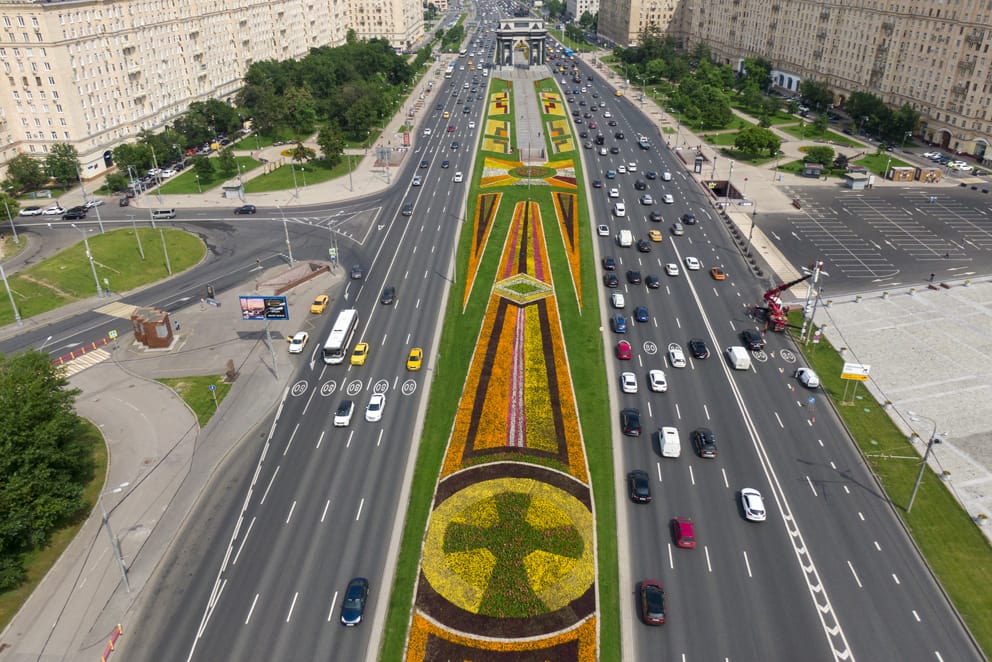 Самый большой цветник Москвы располагается у Триумфальной арки. Здесь шесть тысяч квадратных метров украшают более 470 тысяч цветов: тагетес отклоненный, бегония изящная, пеларгония зональная, колеус гибридный, канна, цинерария, кохия и агератум.