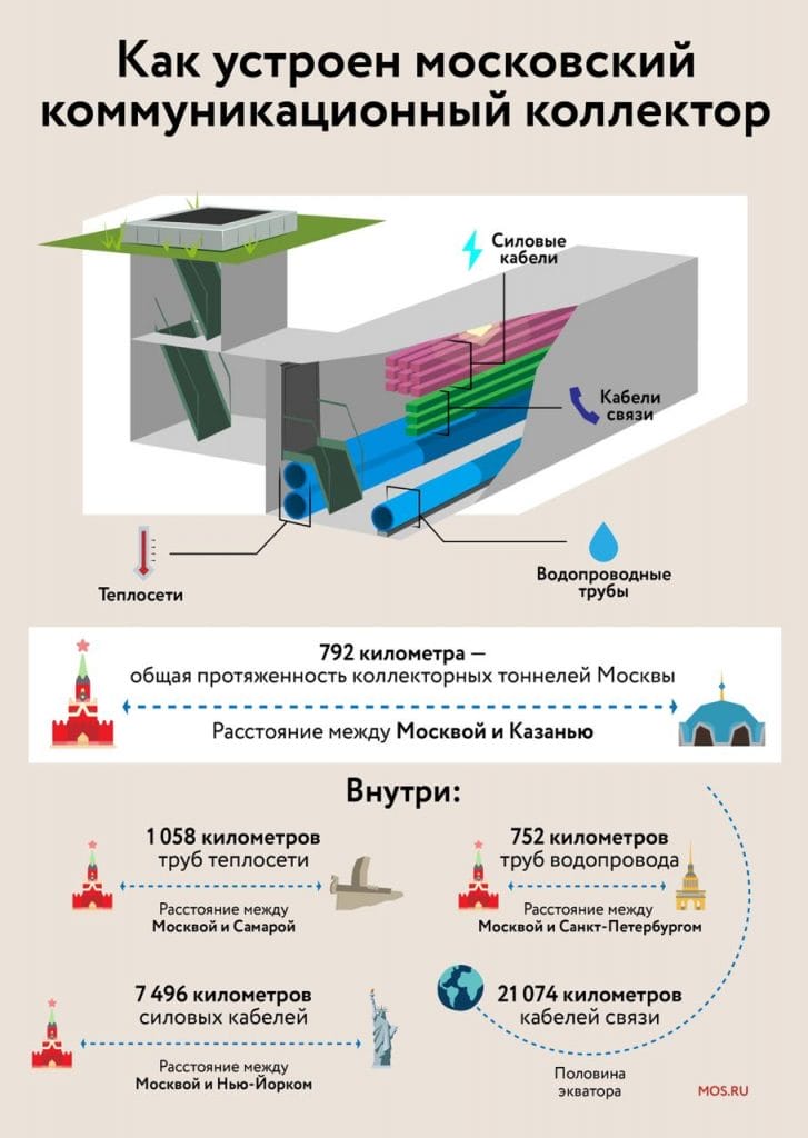 ГУП «Москоллектор» обслуживает 792 километра коммуникационных коллекторов столицы, в которых проложены свыше 7,5 тысяч километров силовых кабелей, а также более 21 тысячи километров связей и спецсвязи, а также трубопроводы теплосети и водопровода.