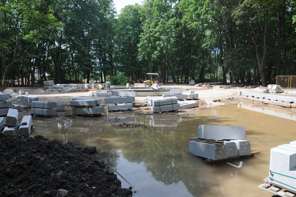 Чашу фонтана собирают немного в стороне. Не хватает только замкового камняМесто под фонтанЗдесь собирают еще один фонтан