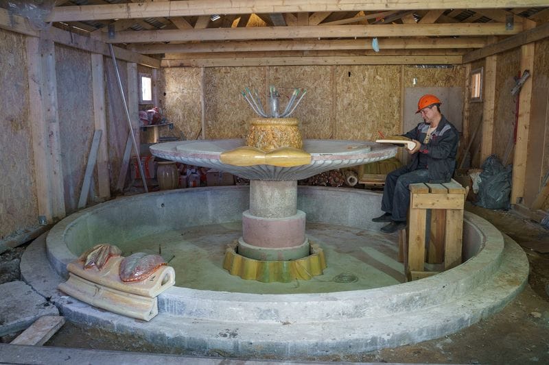 Рабочие уже проложили инженерные коммуникации для фонтана, отлиты нижняя и средняя чаши и выполнено бетонное основание со стальными трубками для подачи воды.