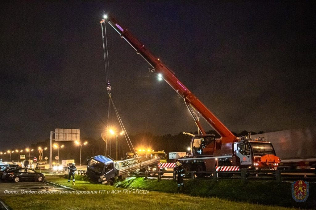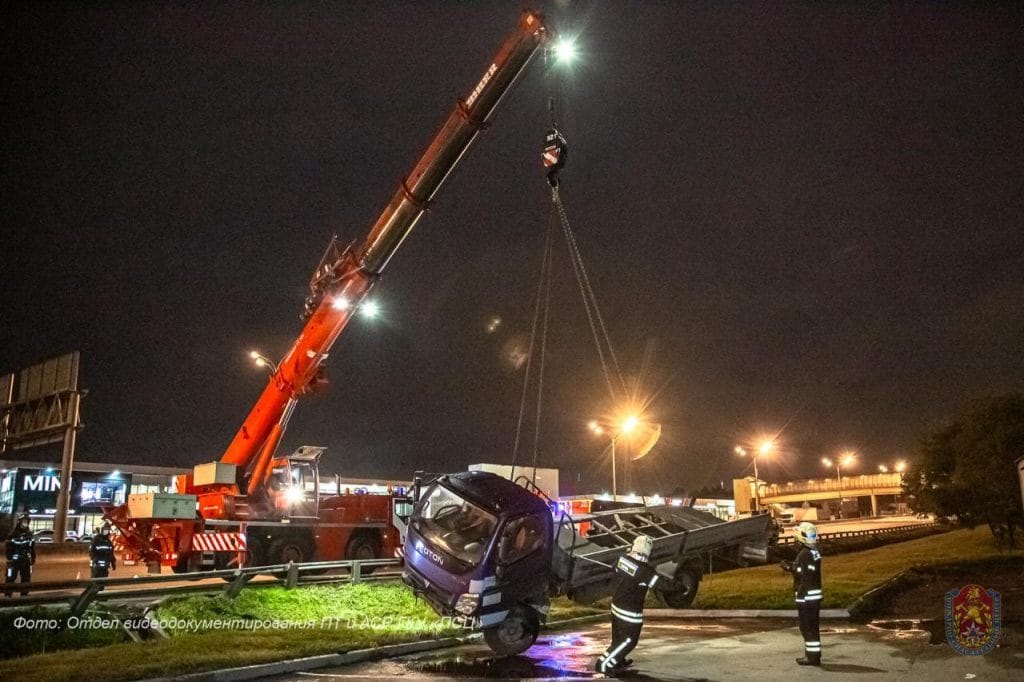 При помощи автокрана пожарные сняли автомобиль с отбойника и поставили его на колёса.
