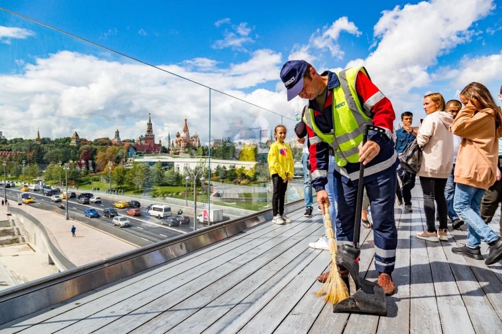 За чистотой Парящего моста следят сотрудники ГБУ «Гормост». Они моют и убирают его, очищают урны и проводят промывку стеклянных ограждений.