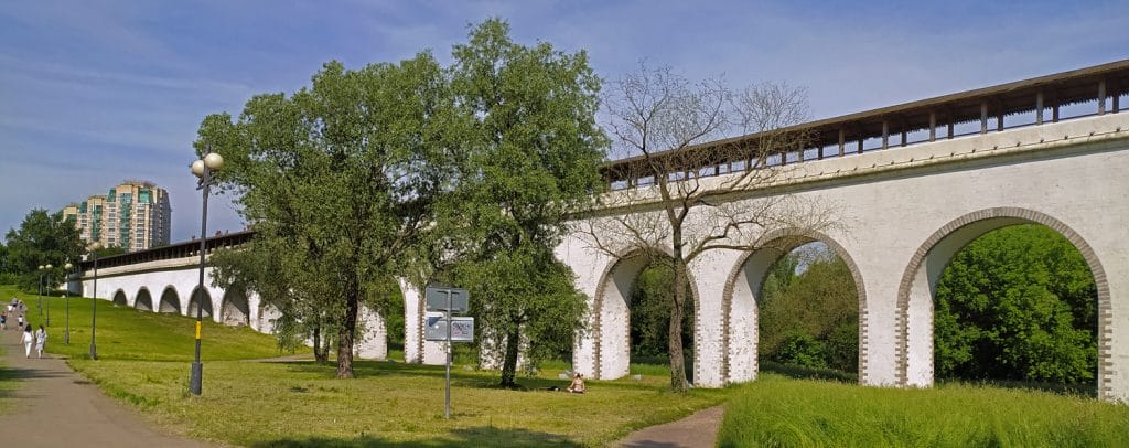 Как работал акведук? Вода из мытищинских ключей по трубам собиралась в специально вырытые водоемы глубиной более 2-х метров, обложенные кирпичом и покрытые тесовыми крышами. Основным сооружением водопровода являлась кирпичная галерея, выложенная листовым свинцом, по которой вода самотеком направлялась из водоемов в Москву. Эта галерея покоилась на каменных устоях высотой до 15 метров, образующих 21 арку. На своем двадцативерстном пути водопровод дважды пересекал реку Яузу: один раз по акведуку, а другой – с помощью чугунных труб, уложенных на дне реки,