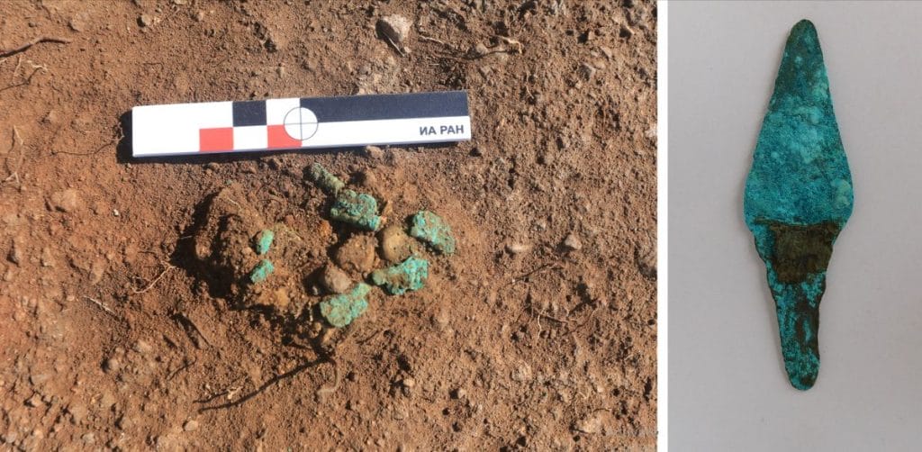 На сегодняшний день в кургане обнаружены два захоронения, относящиеся к северокавказской археологической культуре. В юго-западной части кургана в основании насыпи была похоронена девочка с шейным украшением, также в ее могиле были найдены два керамических сосуда. Второе погребение находилось в центре насыпи: в гробнице, аккуратно выложенной из речных булыжников, был обнаружен скелет, принадлежавший, по всей видимости, мужчине (точные данные будут известны после антропологического исследования). В могиле рядом с останками лежали бронзовый нож, каменный топорик и сосуд. Дно гробницы было когда-то покрыто двухцветной циновкой из растительных волокон, а по бокам, между каменными стенами и циновкой, археологи обнаружили остатки деревянного короба.