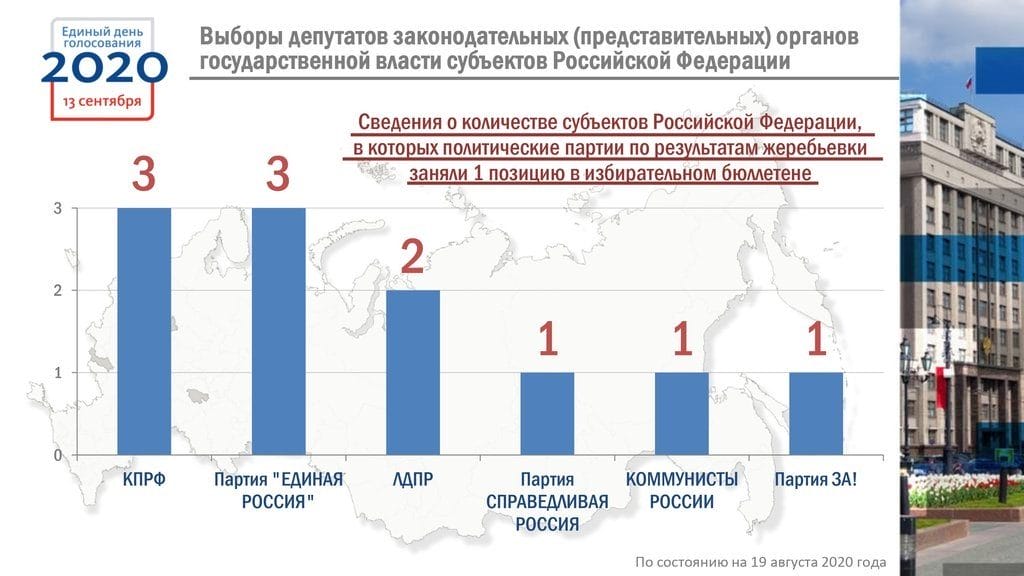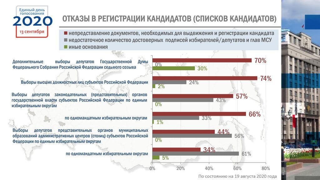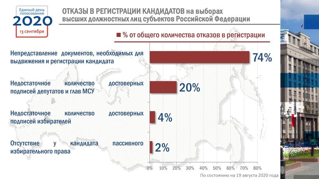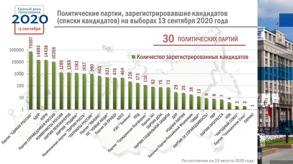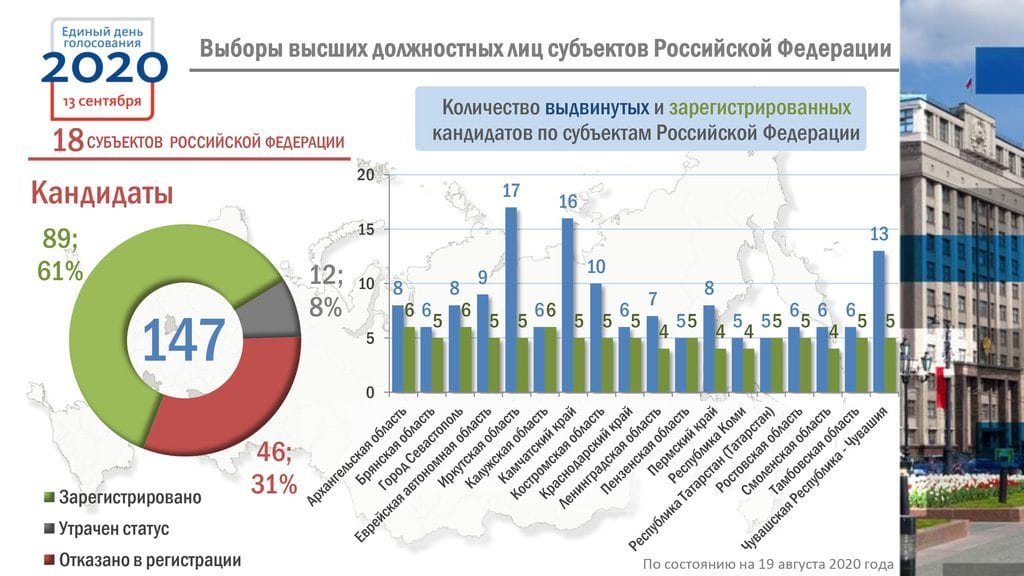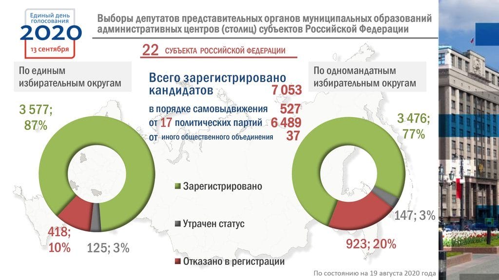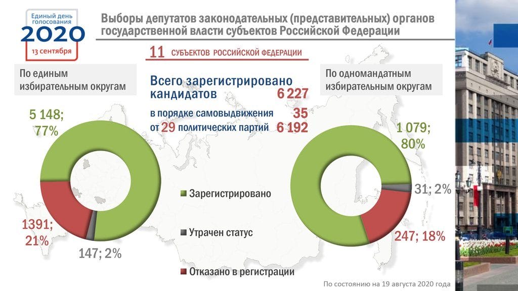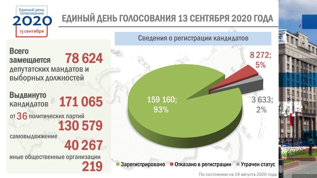 Этап регистрации кандидатов на выборах в единый день голосования 13 сентября 2020 года завершился 13 августа. Одновременно проходит девять тысяч избирательных кампаний по замещению более 78 тысяч депутатских мандатов и выборных должностей. Для участия в выборах выдвинулись более 171 тысячи кандидатов. Из них свыше 130 тысяч от 36 политических партий и чуть более сорока тысяч в порядке самовыдвижения.