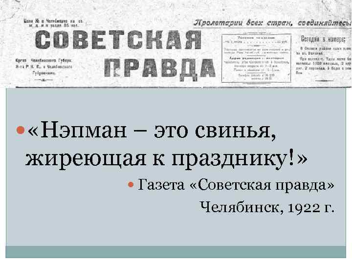 Атмосферу тех лет можно назвать антинэповской вакханалией. Журналисты, писатели, художники словно состязались друг с другом, создавая коллективный портрет отвратительного, жирного гада и его такой же разъевшейся вульгарной бабы, которые пьют и жрут, шикуют, прожигают жизнь на глазах недоедающего трудового народа. Этот карикатурный образ, по сути, врага прочно вошел в сознание советских людей. Справедливости ради следует отметить, что те новые предприниматели могли бы (и должны были) вести себя скромнее, не шокировать и не раздражать еще полуголодное и полунищее население вдруг возникшим богатством, вызывающим образом жизни, порождая в верхах и низах негодующий вопль-вопрос: «За что кровь проливали?!» Могли и должны – но культуры не было, ни общей, ни политической.