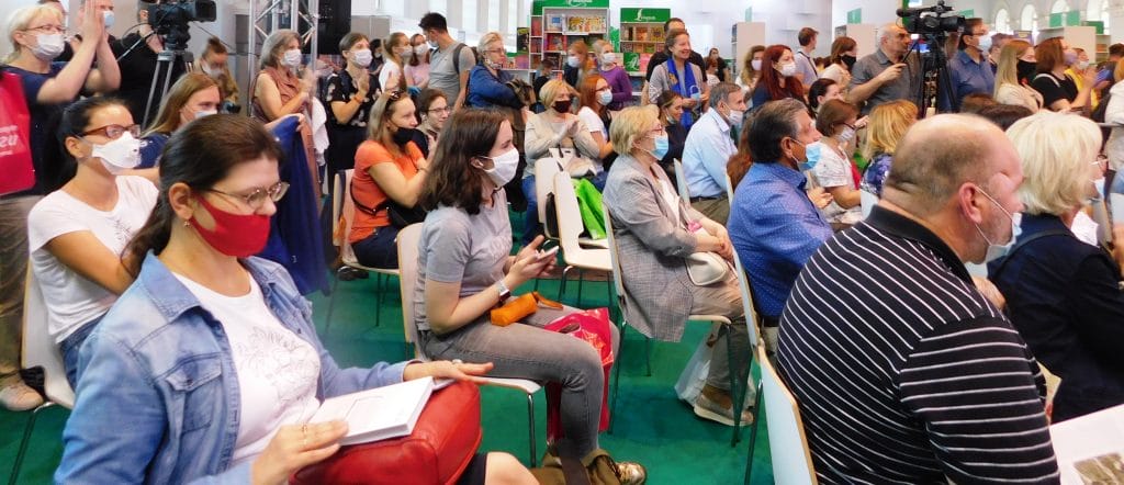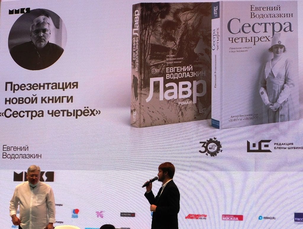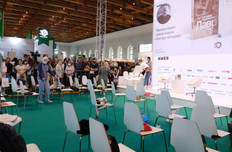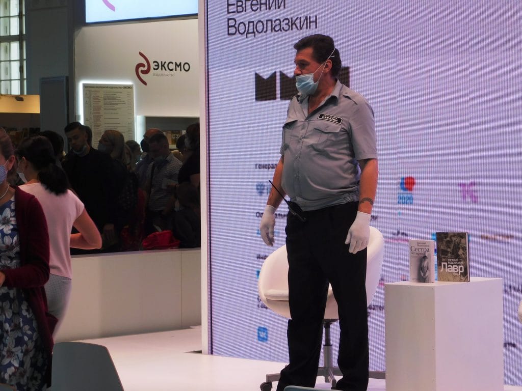 Организаторы презентаций обрушили именно на Водолазкина весь свой нерастраченный пыл борьбы с ковидом. Как теперь часто бывает, вышел некто с безликим бейджем «охрана» и жестко потребовал, чтоб все встали и вышли за периметр «для вашего же здоровья». После этого две изящные девушки нервно собрали и унесли часть стульев. Когда Водолазкин закончил и отправился подписывать книги, опять всех согнали и два человека в противочумных костюмах принялись неспешно изображать дезинфекцию. Ни до, ни после Водолазкина на презентациях Захара Прилепина и Сергея Полонского ничего подобного не было, как и на всей выставке. Марину Степнову тоже никто не дезинфицировал, хотя ей предоставили лучшую и единственную площадку в закрытом пространстве.