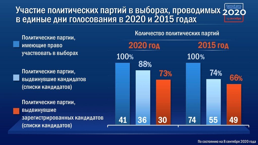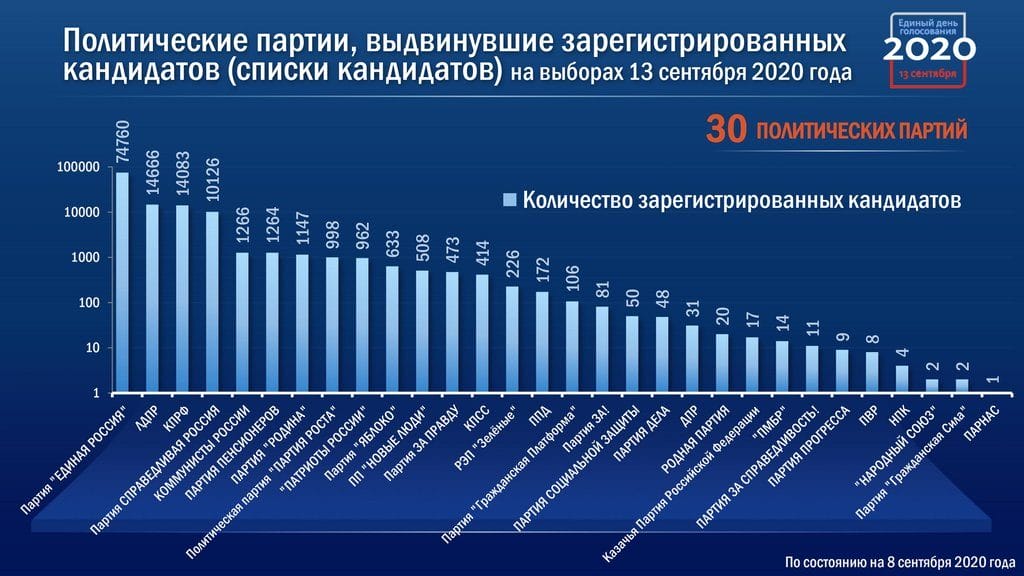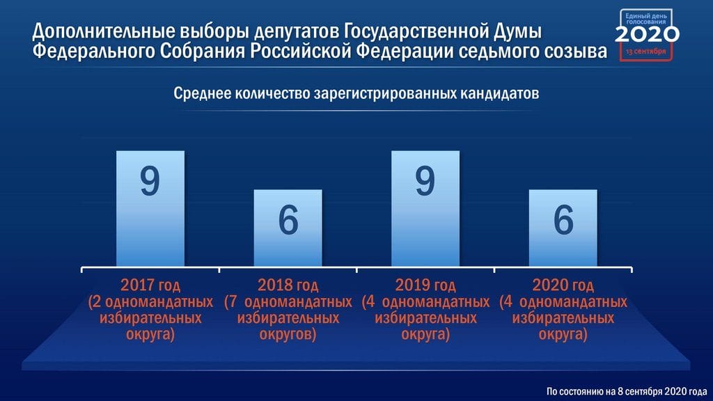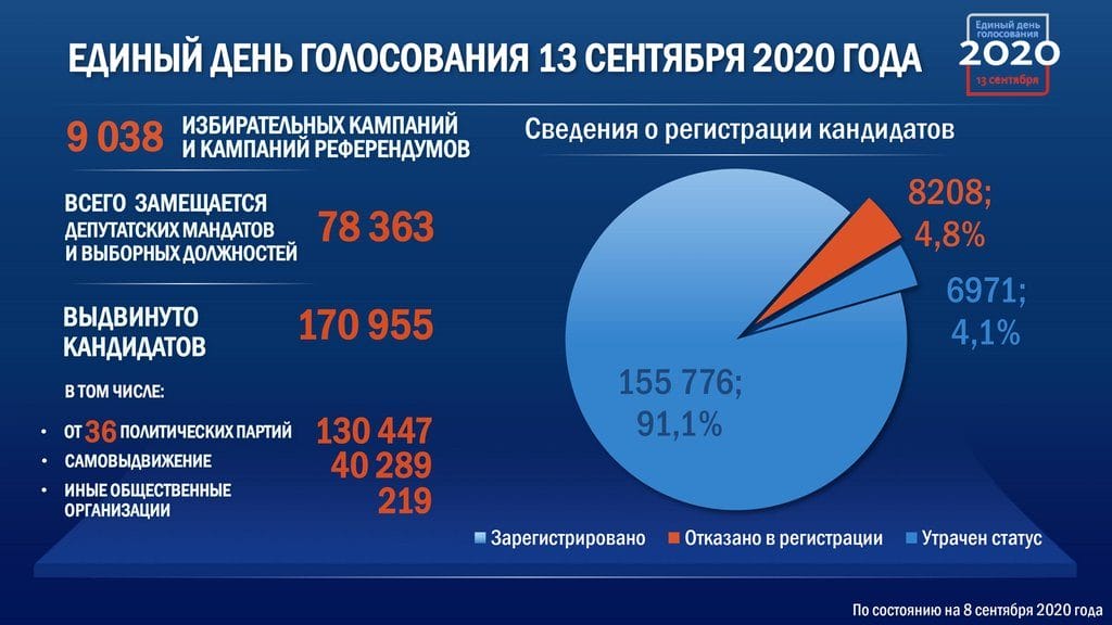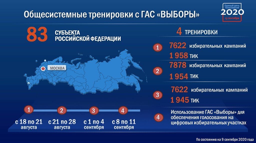 Согласно представленной информации, в единый день голосования 13 сентября в стране состоятся свыше девяти тысяч избирательных кампаний всех уровней в 83 субъектах Федерации за исключением Кабардино-Балкарии и Петербурга.