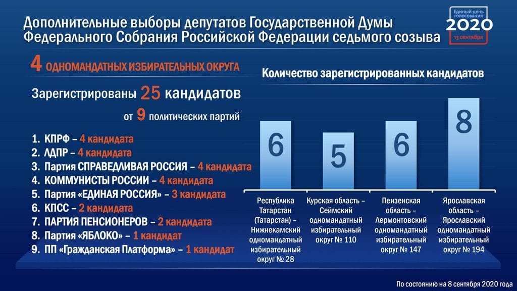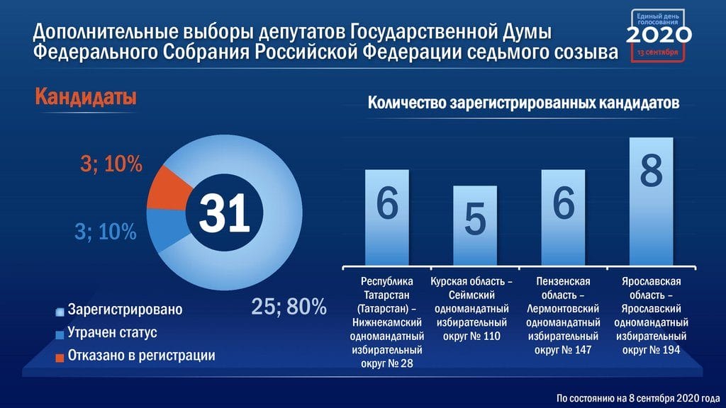 Среди прочего проходят дополнительные выборы депутатов Государственной Думы в четырех одномандатных избирательных округах –Татарстане, также Курской, Пензенской и Ярославской областях. На четыре мандата сроком год из возможных пяти претендовал 31 кандидат. Зарегистрировано 25 кандидатов. Трое отказались от борьбы и еще троим отказали.