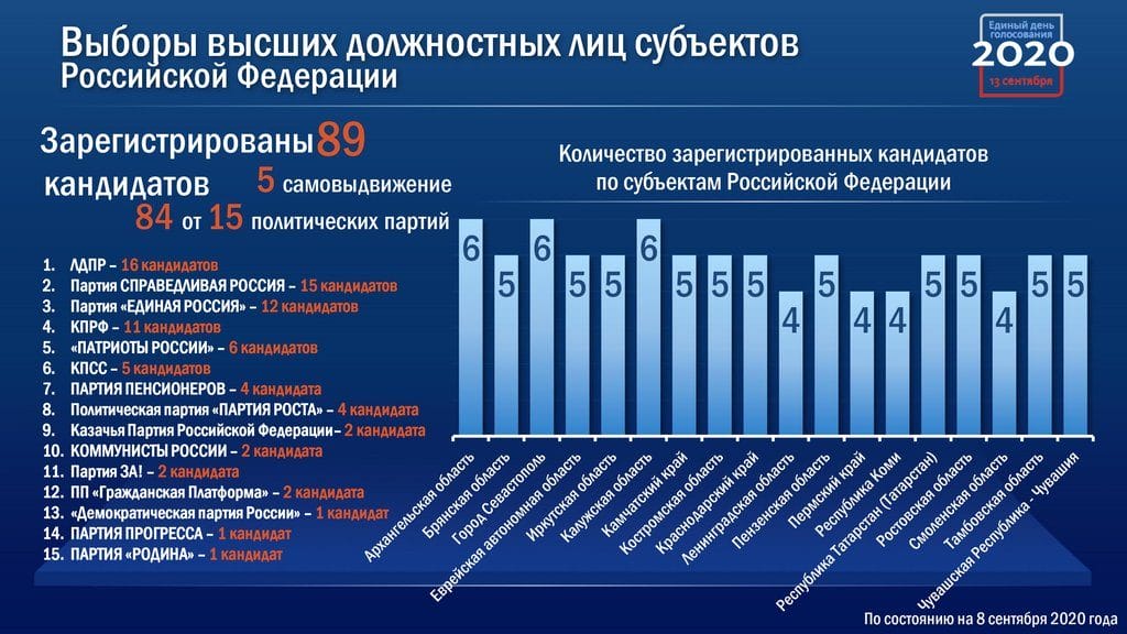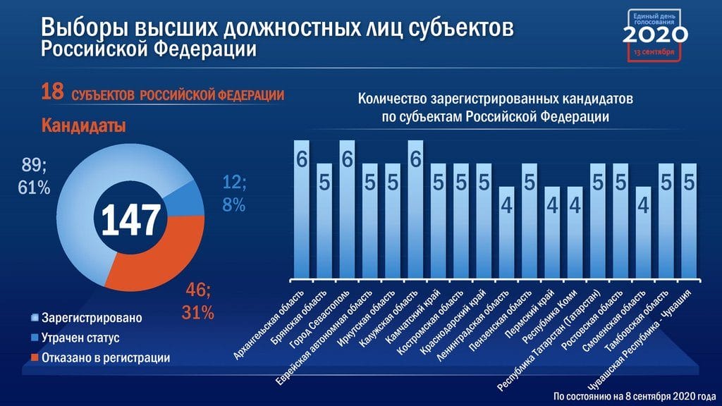 Выборы губернаторов проходят в восемнадцати регионах. Выдвинулись 147 кандидатов. 89 из них зарегистрированы. 12 утратили статус кандидата. По различным причинам было отказано 46 кандидатам – почти треть. Большинство отказов связаны с тем, что кандидаты не представили необходимые документы.