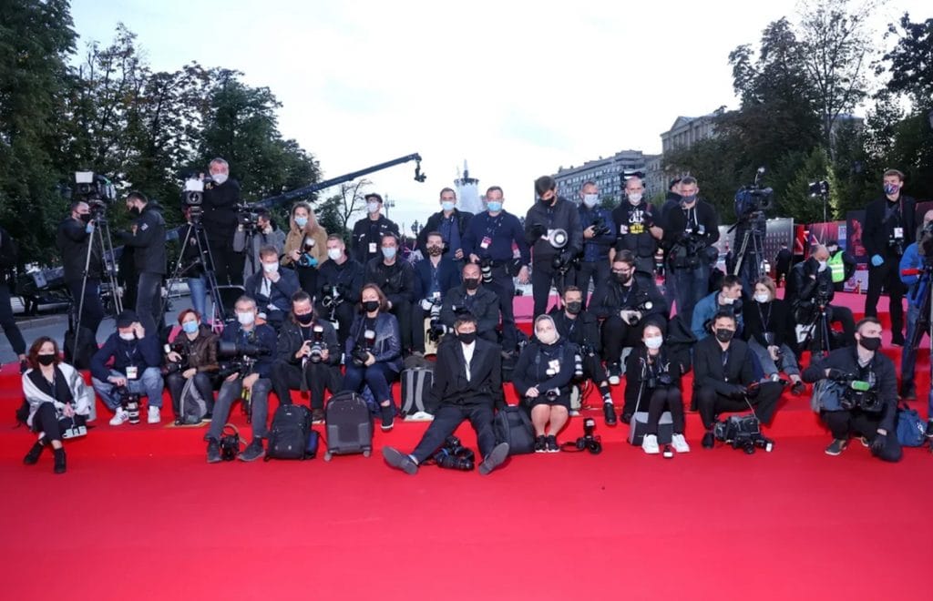 Погода благоприятствовала появлению на красной дорожке гостей фестиваля в вечерних нарядах. Армия фотографов в защитных медицинских масках – неизменный атрибут светских вечеринок этого года – расположилась перед лестницей концертного зала «Россия».