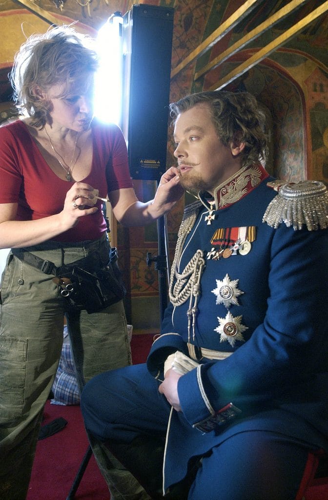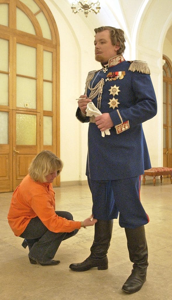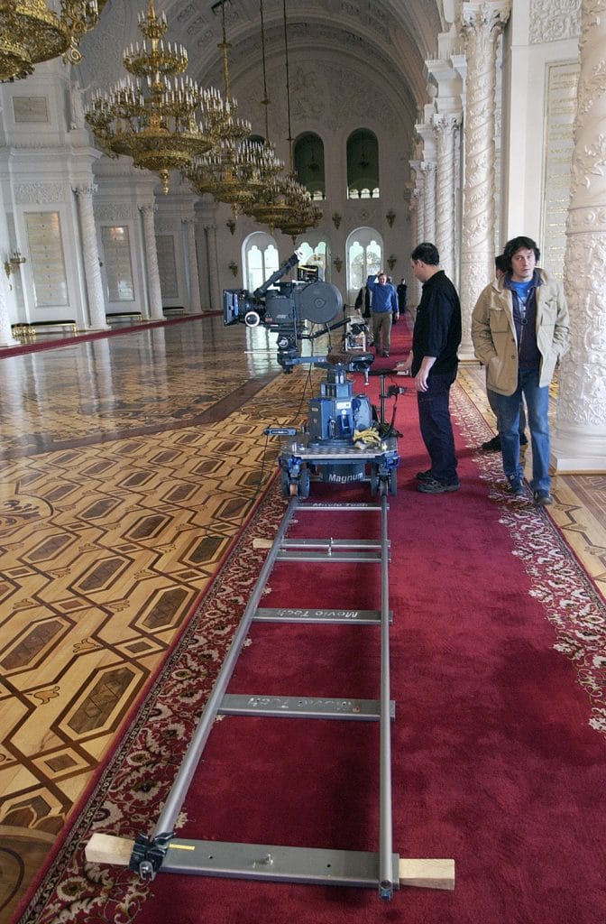 Были у нас трудности и с организацией съемок. Система согласования для проведения съемок в Кремле была невероятно сложна. Но поверили имени нашей студии – Студии ТРИТЭ Никиты Михалкова, поверили нашему предыдущему опыту, поскольку мы довольно часто снимали на Красной площади и в Кремле и ни разу не подводили. Мы всегда укладывались в срок, не мешали своей деятельностью работе объекта, всегда оставляли за собой нормальную память. И на этот раз все члены съемочной группы крайне бережно и с благодарностью относились к тому, что нам разрешили снимать в таком месте, как Георгиевский зал Кремля. Мы даже специально сшили сотни войлочных тапочек, в которые обувалась вся наша команда. А для тележки, на которой передвигается операторский кран с камерой, уложили длинные ковровые дорожки. Мы не оставили ни одной царапины на старинном паркете.