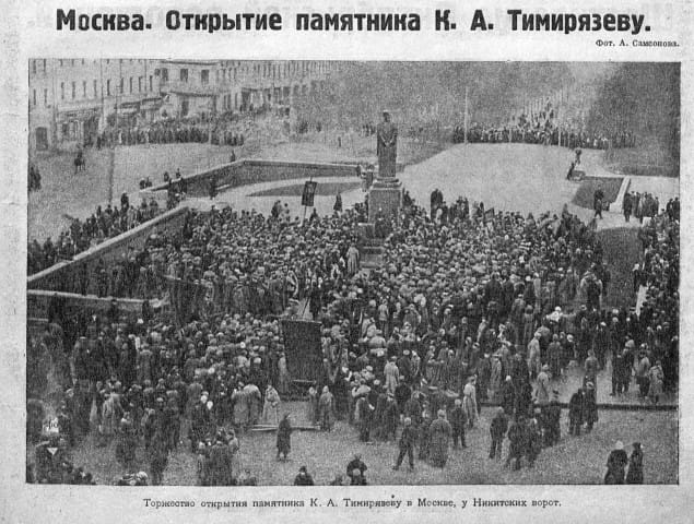 «День 4-го ноября был ознаменован в Москве торжеством союза науки и труда. У Никитских ворот, в конце Тверского бульвара, был открыт памятник революционеру-борцу и ученому Клименту Аркадьевичу Тимирязеву. Торжество, несмотря на пасмурную погоду, привлекло множество депутаций ученых и учебных учреждений и организаций и несколько тысяч отдельных граждан, главным образом, преподавателей и слушателей высших учебных заведений. К подножию затянутого холстом памятника собрались представители различных рабочих организаций, ведомств и учреждений с венками, члены Президиума Моссовета, профессора, группы детей школ, носящих имя К. А. Тимирязева, и др. Под звуки «Интернационала» с памятника, представляющего собой высеченную из целой глыбы гранита фигуру покойного К. А. Тимирязева во весь рост, спала пелена…», – сообщала газета «Известия» в номере от 6 ноября 1923 года.