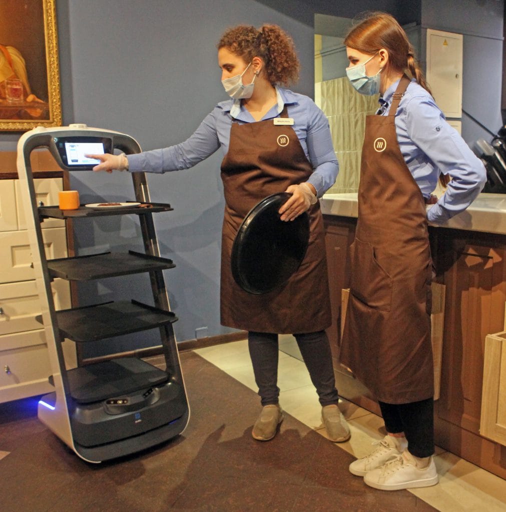 Наталья Белкина, исполнительный директор одного из кафе рассказала, что с 30 октября на работу вышли необычные сотрудники – робокот и эмоциональный робот-официант. На задачи, которые нужно выполнить, роботу указывает настоящий официант: доставлять гостям заказы, отвозить грязную посуду на мойку. Внешне робот имеет приятный вид, хотя и напоминает этажерку, на разных полках которой располагаются подносы. Заказ робот не принимает, он только может подвезти тарелки с едой и убрать грязную посуду. По потолку проложена специальная сеть, официанты набирают на табло, похожем на телефон, номер столика и робот сам едет к клиенту, лавирует между столиками и предупреждает посетителей. Механического помощника официантов запрограммировали специально под нашу кофейню. Зарядки робота хватает на работу с 8 утра до 23 вечера. Замечательно, что живые сотрудники, благодаря освободившемуся времени, смогут больше общаться с посетителями. Реакция гостей кафе всегда одинакова – абсолютный восторг!
