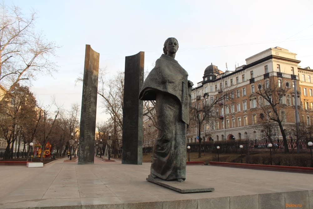 В июне 1976 года на Сретенском бульваре рядом с бывшим доходным домом Страхового общества «Россия» был установлен один из самых необычных памятников Крупской (скульпторы Е. Ф. Белашова, А. М. Белашов, архитектор — В. Л. Воскресенский): как-будто по бульвару идёт не всем привычная «бабушка русской революции», а молодая женщина, за ростовой фигурой которой установлены два 10-метровых пилона. На них высечены две цитаты из её выступлений.