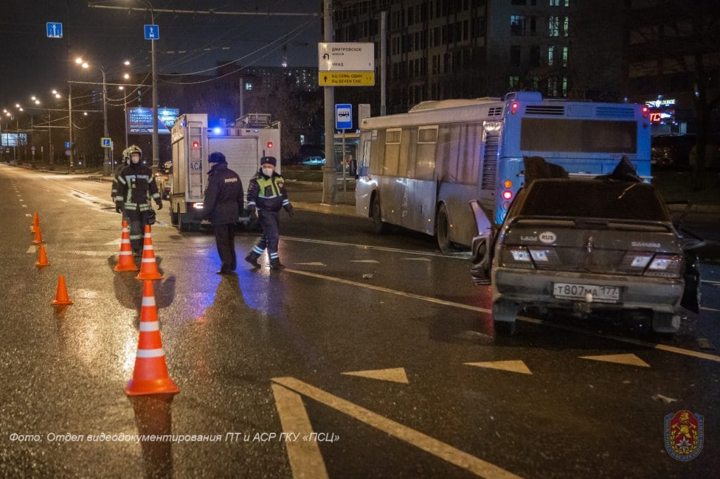 Серьезное дорожно-транспортное происшествие произошло вечером 20 ноября на пересечении Дмитровского и Коровинского шоссе. Легковой автомобиль столкнулся с городским автобусом. В результате пассажиры «Лады» оказались зажаты в салоне авто. Движение транспорта было блокировано по двум полосам.