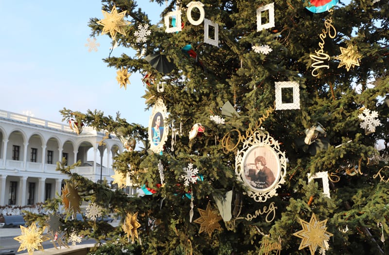 Парк Северного речного вокзала украшают к новогодним праздникам. В этом году здесь установили «театральную елку» – на дереве развешены портреты выдающихся деятелей культуры и искусства: Евгения Вахтангова, Анны Павловой, Елены Образцовой и других, а также театральные маски и веера.