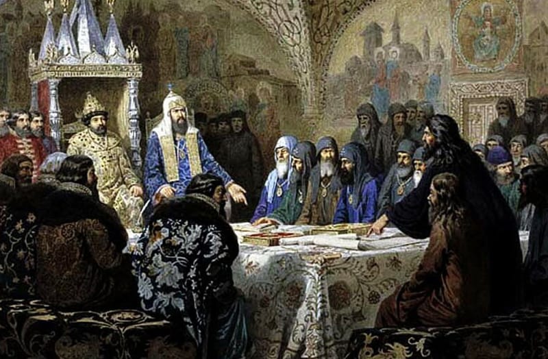 На снимке: царь Алексей Михайлович и патриарх Никон на Поместном соборе 1654 года.