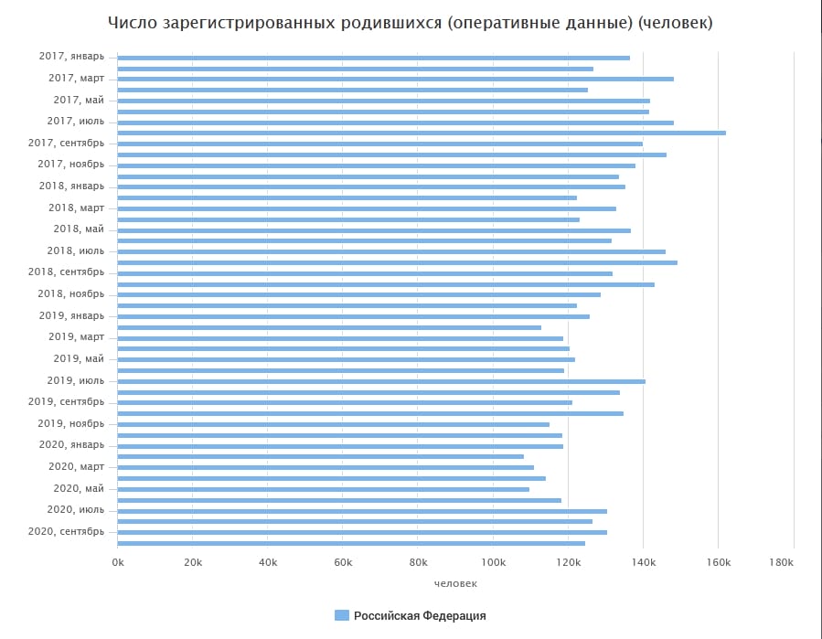 Вот, к примеру, сайт Федеральной службы государственной статистики. Здесь есть возможность не только посмотреть цифры, но и построить график. Возьмем, например, график рождаемости за три года: 2017, 2018, 2019-й.