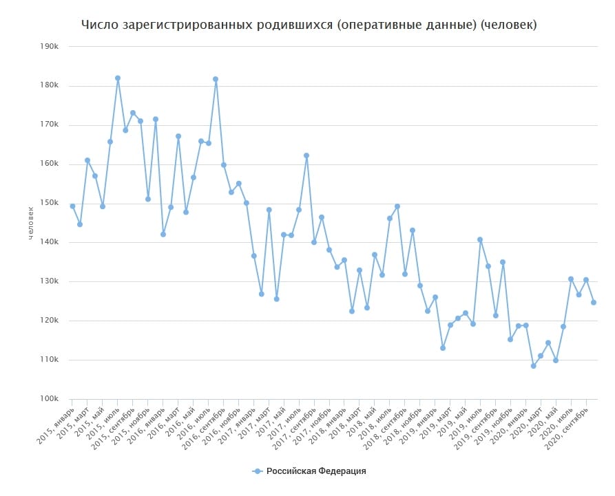 Затем обычно идет резкий сентябрьский спад, новый небольшой пик в октябре, который чуть-чуть не дотягивает до августовских и июльских показателей, и затем снова спад. Своего минимума рождаемость достигает в феврале. В 2017 году этот показатель был 125 534, в 2018-м – 122 425, в 2019-м – 108 427.