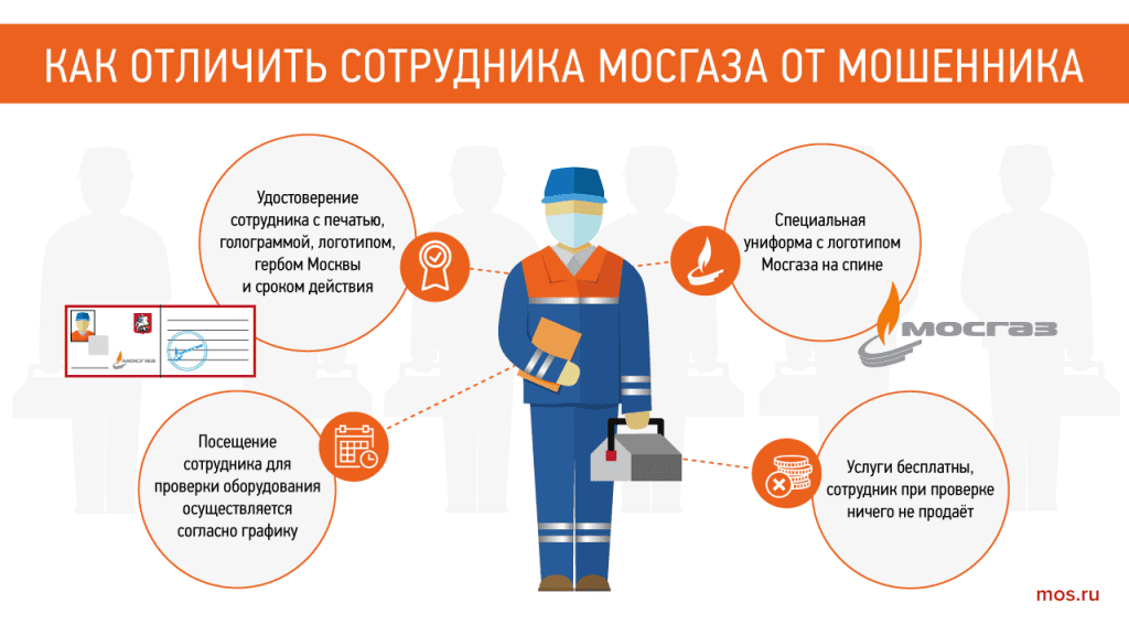 В последнее время участились случаи мошенничества. Прежде чем впустить специалиста в дом, стоит обратить внимание на его форму. Сотрудники предприятия одеты в форму темно-синего цвета со светоотражающими полосками, оранжевой кокеткой и логотипом «МОСГАЗ» на спине. При себе сотрудник должен иметь служебное удостоверение и использовать средства индивидуальной защиты.