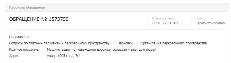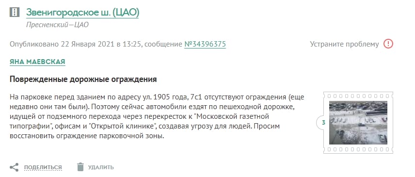 Да, мы забили в колокола. Опубликовали обращение на портале «Мой город». Номер обращения 34396375, дата публикации 22 января, 13.25. Срок рассмотрения – 8 дней, то есть ответ должен появиться 30 – 31 января. Опубликовали обращение на сайте Департамента транспорта Москвы. Номер обращения 1573750, дата создания 22 января, 11.31. Срок рассмотрения – 30 дней, значит, не раньше конца февраля. Позвонили в управу Пресненского района. Там обещали рассмотреть, сроки не назвали.