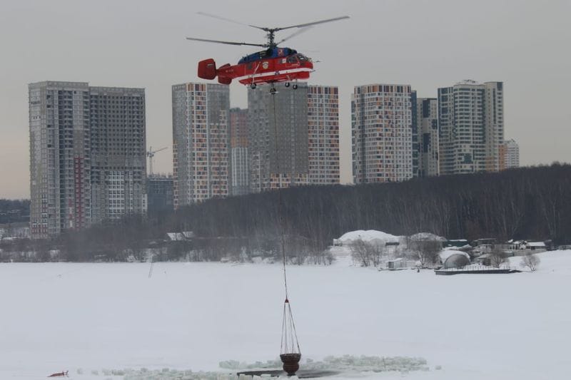 Водосливное устройство, способное переносить до 5 тонн воды, опускается в искусственно созданную прорубь с высоты 40 метров. Этот непростой навык пилоты пожарных вертолетов Ка-32А Московского авиацентра отрабатывали в течение месяца.