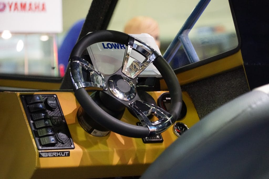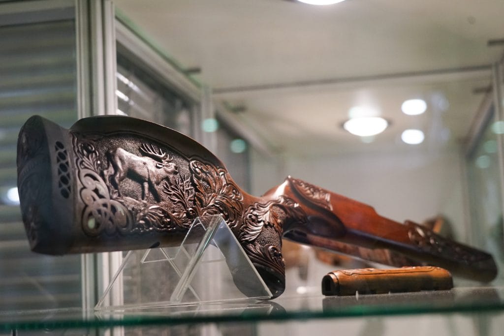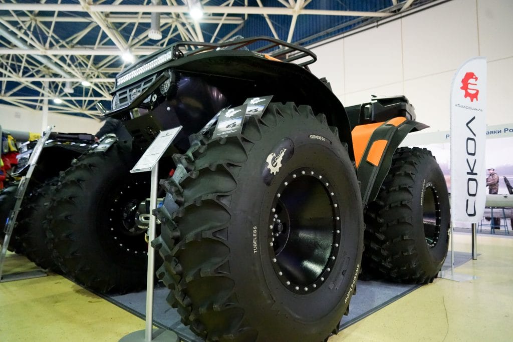 Второй зал выставки поразил разнообразием товаров для охоты. Авторские резные ружья, пистолеты и винтовки, топоры и поблескивающие дамасской сталью ножи. Здесь же представлена специализированная транспортная техника: огромные, словно трактор, квадроциклы, натертые до блеска моторные лодки и прочее.