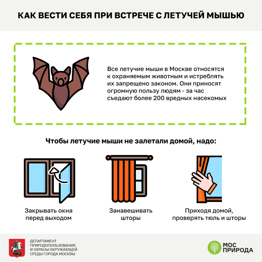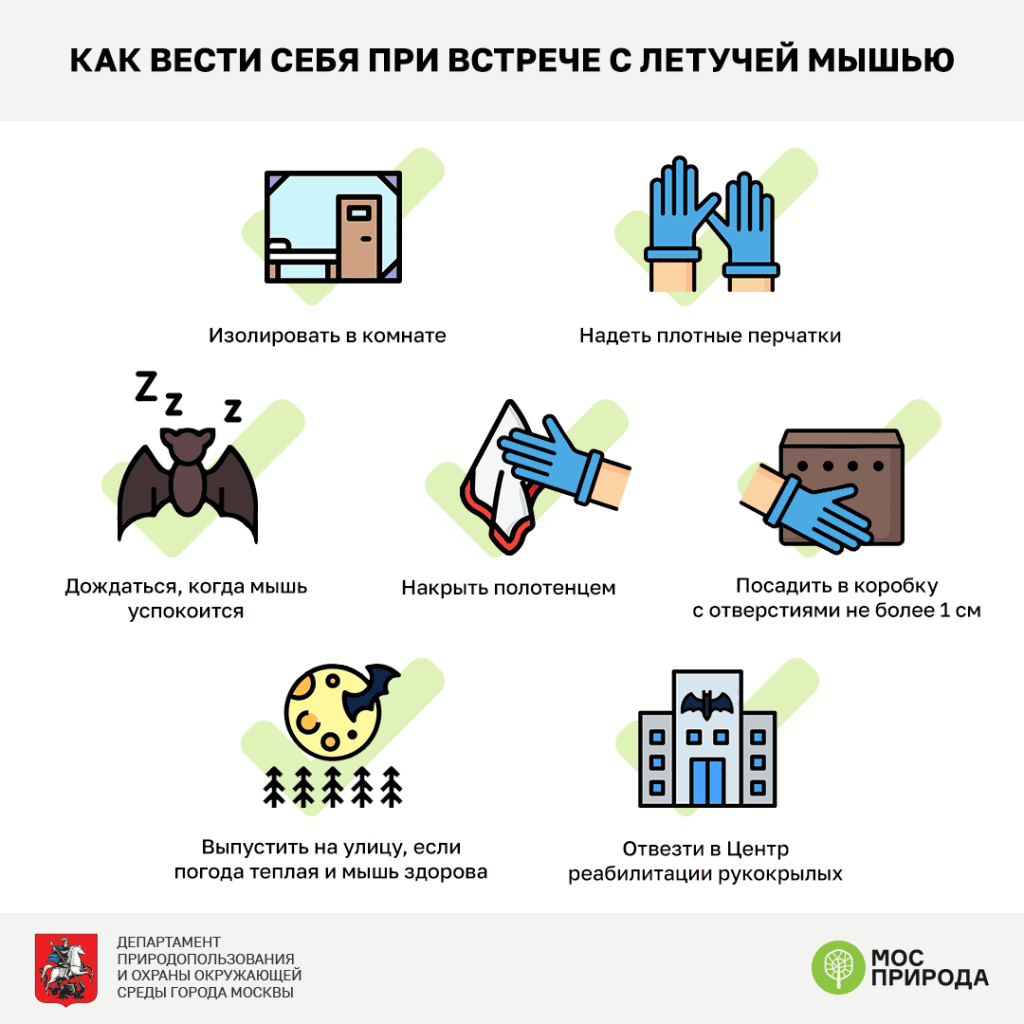 Если в ваш дом случайно залетела летучая мышь, нужно изолировать ее в комнате, накрыть полотенцем и пересадить в коробку с отверстиями для циркуляции воздуха (не более 1 см). Брать в руки мышку можно, лишь надев плотные перчатки. Если за окном тепло и летучая мышь здорова, ее можно выпустить на улицу. В ином случае ее нужно отправить в Центр реабилитации рукокрылых.
