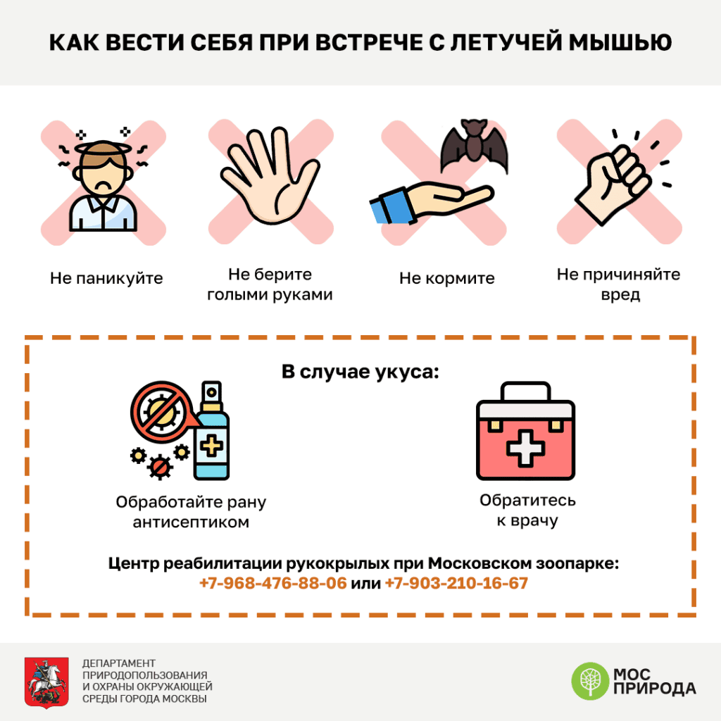 За помощью можно обратиться в Центр реабилитации рукокрылых при Московском зоопарке: +7-968-476-88-06 или +7-903-210-16-67.