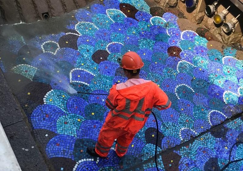 Стеклянные, гранитные, бетонные, металлические поверхности сооружений, а также перильные ограждения и лестничные сходы промоют специально подобранным для этих работ раствором.