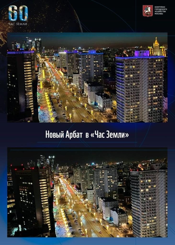 «Москва принимала участие в акции уже в 13-й раз, в этом году на час – с 20.30 до 21.30 – была отключена подсветка более 2,8 тыс. зданий, сооружений и городских территорий, в том числе Московского Кремля, Государственного исторического музея, ГУМ и ЦУМ, парка «Зарядье», Манежа, Большого театра, храма Христа Спасителя, Триумфальной арки и стадиона «Лужники». Впервые была выключена зеленая тематическая ландшафтная подсветка Бульварного кольца и Воробьевых гор», – рассказал заместитель Мэра Москвы Петр Бирюков.