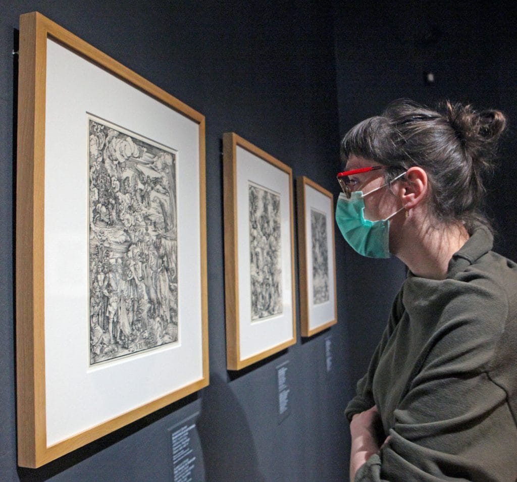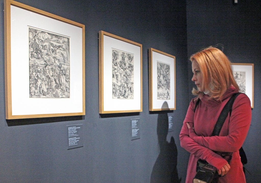 Серия «Апокалипсис», созданная мастером в 1496 – 1498 гг., стала отдельным разделом выставки. Пятнадцать листов иллюстрируют последнюю книгу Нового Завета «Апокалипсис», или «Откровение Иоанна Богослова». Это была первая крупная работа молодого художника. Данный цикл отличают точность в передаче библейского слова и неисчерпаемая фантазия самого мастера, вдохновленного мистическими строками древних текстов. Самым известным произведением из серии является лист «Четыре всадника Апокалипсиса». Серия этих гравюр до сих пор считается непревзойденным шедевром полиграфического искусства.