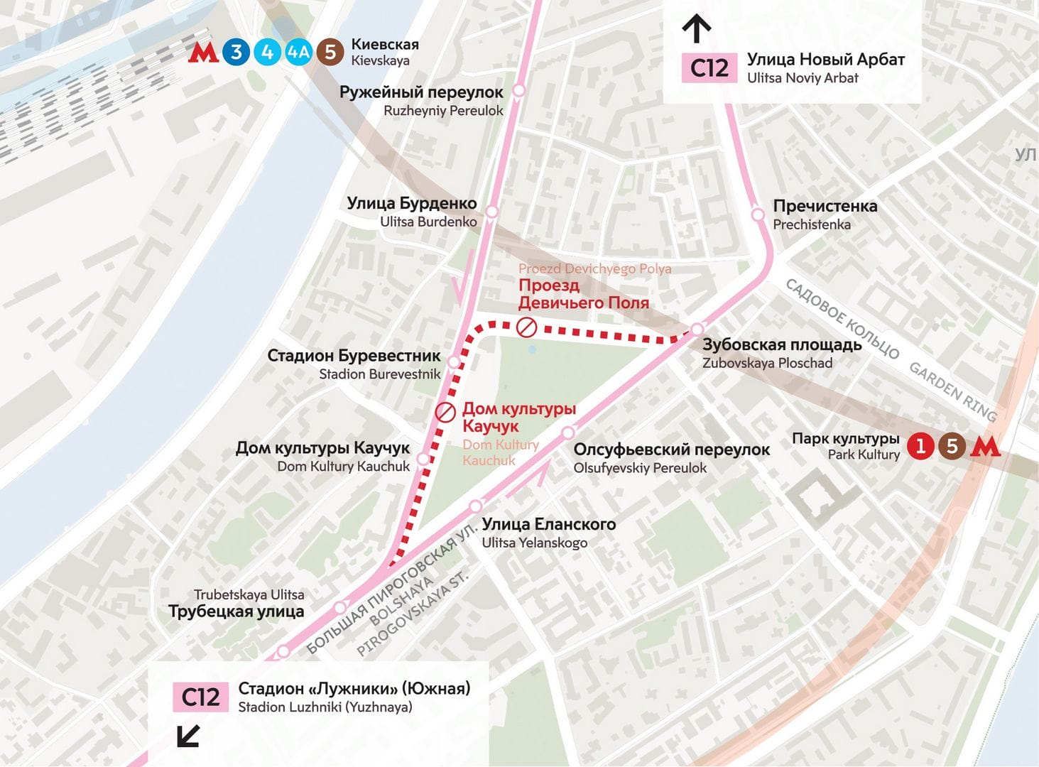 2, 5, 7, 9, 12, 14, 16, 19, 21, 23 и 26 апреля при движении от стадиона «Лужники» вместо улицы Еланского, Плющихи и проезда Девичьего Поля автобусы № С12 поедут по Большой Пироговской улице, говорится в сообщении Мосгортранса.