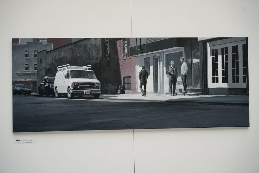 Художник Роман Ляпин представил свои масштабные работы, на которых изображены необычные ракурсы городов с высоты птичьего полета в пограничное время суток, когда город «немножко сияет». Но кроме этих работ, привлекла внимание «Ольховая аллея». По словам автора, эта картина напоминает ему о детстве, а также он периодически создает работы, на которых есть вход или выход куда-то.