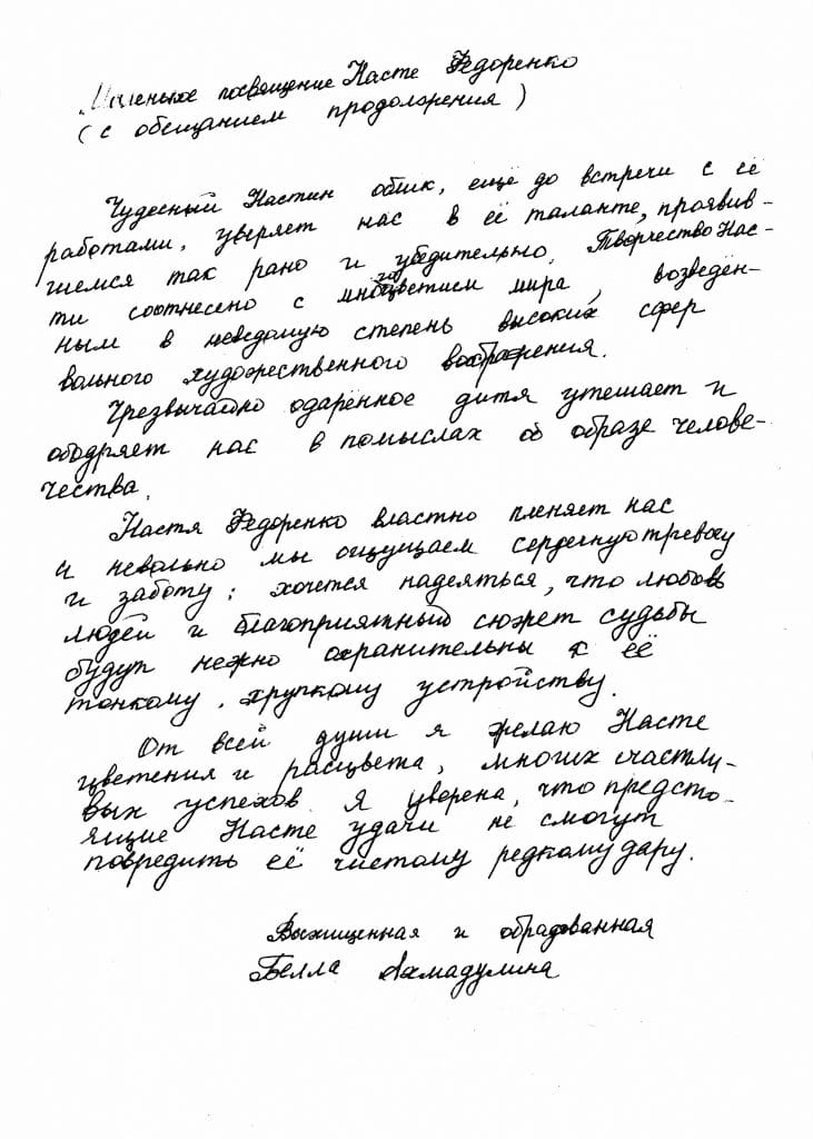 Обещанного продолжения, к сожалению, не случилось. Но эти строки много значили для меня в то время, и не утратили свою ценность до сих пор, и, уверена, в будущем останутся бесценными. Спасибо, Белла Ахатовна!