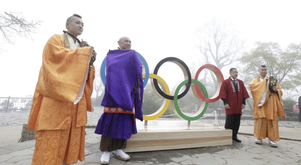 Тем временем на горе Такао одновременно были открыты олимпийские кольца, сопровождаемые церемониальным выступлением монахов из близлежащих храмов с участием олимпийского талисмана «Токио-2020» Мирайтова.