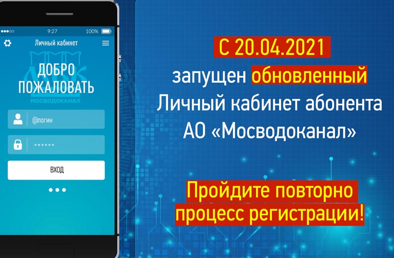 АО «Мосводоканал» запустил обновленный Личный кабинет абонента. В результате проведенной работы значительно расширены возможности сервиса. К уже существующим опциям добавились новые, например, заходить и работать теперь можно с любых устройств: стационарных компьютеров, ноутбуков, планшетов, смартфонов. Для физических лиц упрощен процесс регистрации и передачи показаний приборов учета, а оплачивать услуги теперь можно непосредственно в личном кабинете, просто необходимо обновить данные пройдя перерегистрацию и заново привязать договор (лицевой счет). В качестве логина может быть выбран номер мобильного телефона или адрес электронной почты.