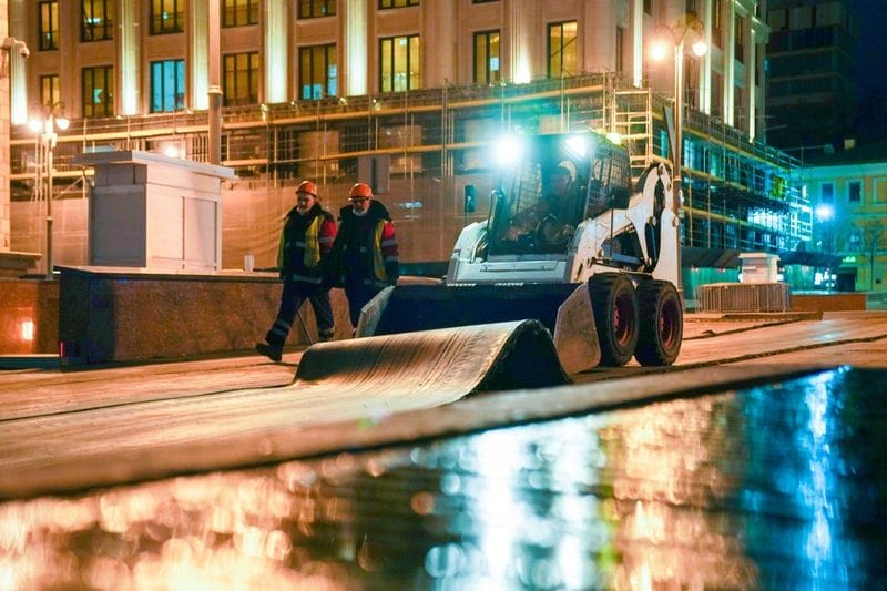 «С помощью прочного резинового покрытия защитили от возможных разрушений и деформации гранитное мощение на маршруте движения военной техники на репетицию и Парад Победы. Между собой прорезиненные ленты надежно скреплены металлическими пластинами», – сообщает Telegram-канал Комплекса городского хозяйства Москвы.