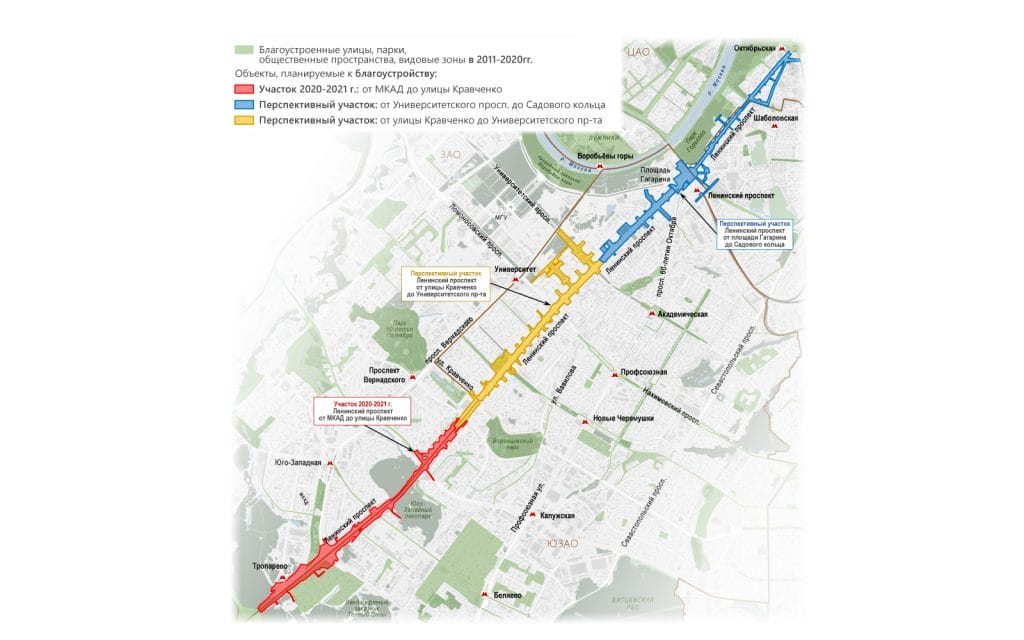 «Сегодня в этом районе идет строительство новых станций метро. Поэтому благоустройство Ленинского проспекта пройдет по нестандартной схеме. Сначала – в 2020-21 годах – на периферийном участке от улицы Кравченко до МКАД», – сообщил мэр Москвы Сергей Собянин в своем личном блоге.