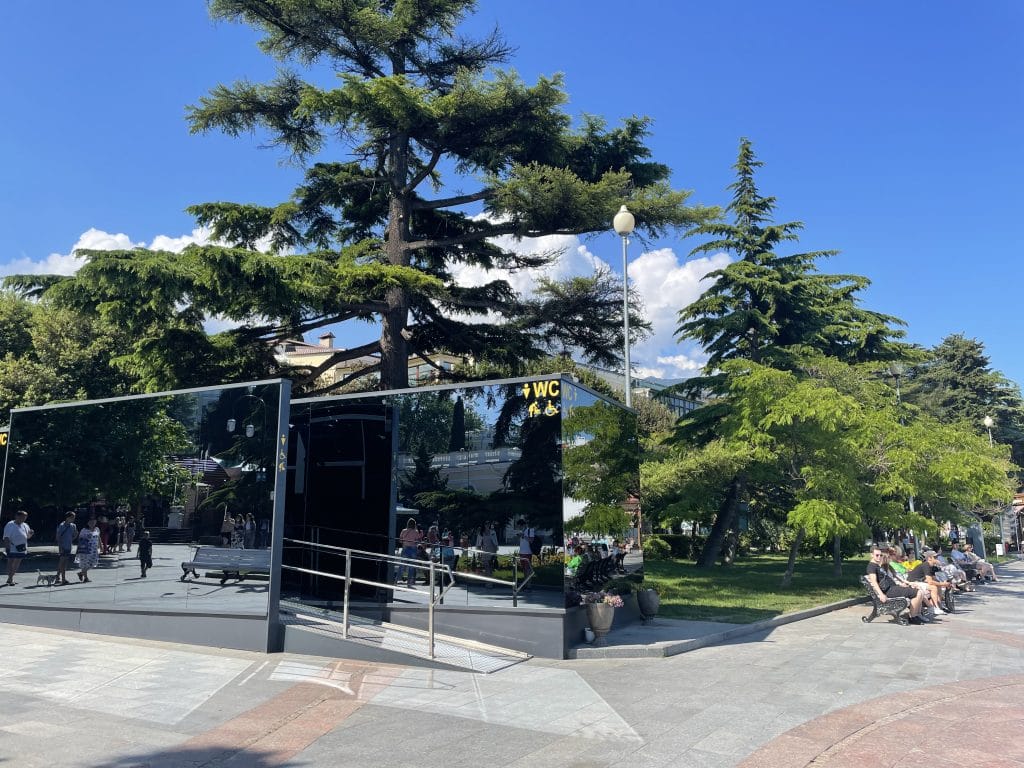 С моря веет прохладой, набережная забита людьми: живой поток, не останавливаясь, движется в обе стороны, лавочки и парапеты – усеяны отдыхающими. Кто-то под палящим солнцем играет для отдыхающих на гитаре, заодно пытаясь немного заработать, двое пожилых мужчин расположились за шахматной доской, ростовые куклы пристают к гуляющим, предлагая фото за деньги. Полиции особо не видно. Однако мы наблюдали инцидент, когда мимо очень быстро пробежал какой-то сильно загоревший парень, видимо из тех, кто выдергивает из рук гаджеты и кошельки, в основном у приезжих, и убегает. Очень быстро на набережной появилась полиция в полной экипировке, в касках и с автоматами. Чем закончилась история – неизвестно, однако, судя по всему, такие «бегунки» здесь не редкость. Мы, инстинктивно посильнее прижав свои кошельки и крепче обхватив телефоны, продолжили променад.